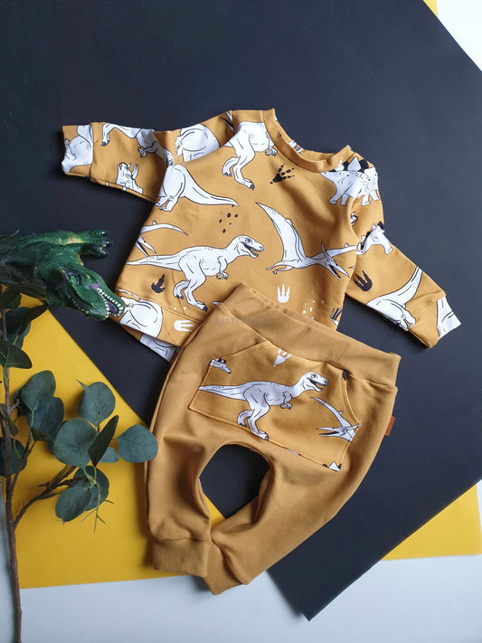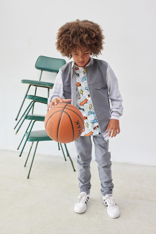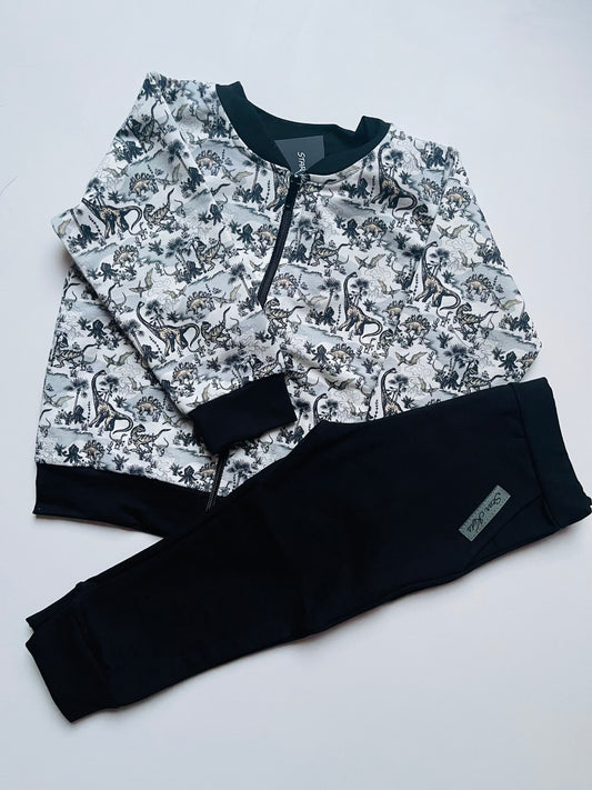 Jongens Setje 'Jurassic' Vestje Met Rits Dinoprint Licht Gijs / Zwart en Joggingbroek Met Zakken Zwart