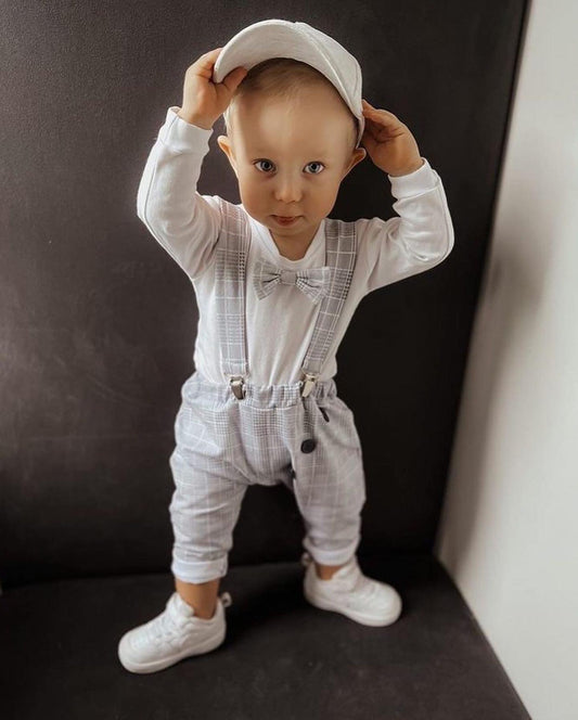 Stoer Pakje Twee-delig 'Blitse Bretels' Grijs Geruit Broek en Bretels Witte Romper met Vlinderdas