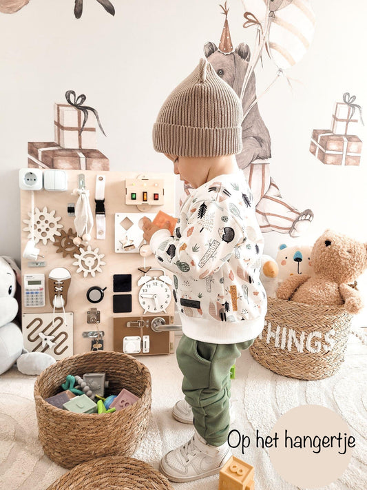 Jongens Setje 'Bosdieren' Vestje Met Rits Dierenprint Wit en Joggingbroek Met Zakken Olijf-Groen