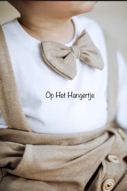 Jongens Setje 'Artiest' Longsleeve met Vlinderdas Wit en Broek Met Vaste Bretels Beige