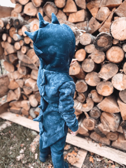 Jongens Setje 'T-Rex' Jack Met Capuchon Dinosaurus Stekels op Achterzijde En Broek Donkel-Blauw Stonewashed Motief