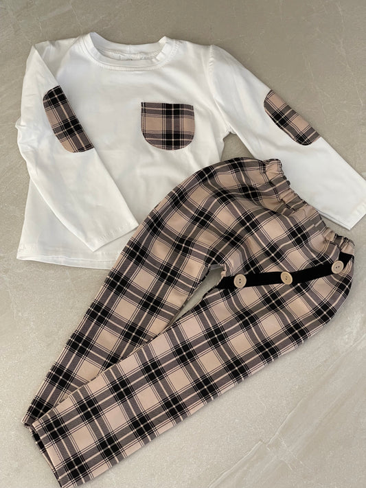 Jongens Setje 'Sergé' 2 Delig Longsleeve met Zak en Broek Beige / Zwart Geruit