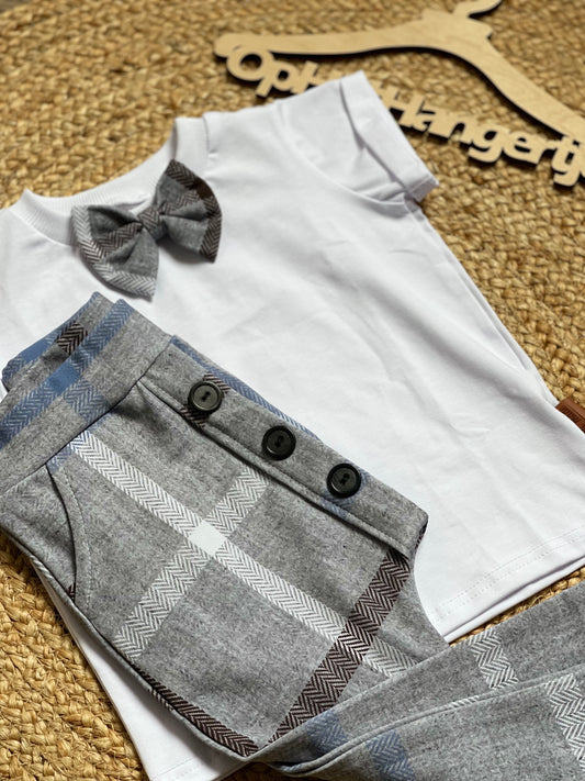 Jongens Setje 'Entertainer Grey' T-shirt met Vlinderdas Wit en Broek Decoratieve Knopen Grijs Geruit