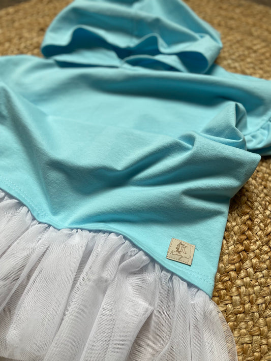 Meisjes Tuniek ‘Louise’ Met Capuchon en Korte Mouwen Met Ruches en Tule Turquoise Blauw