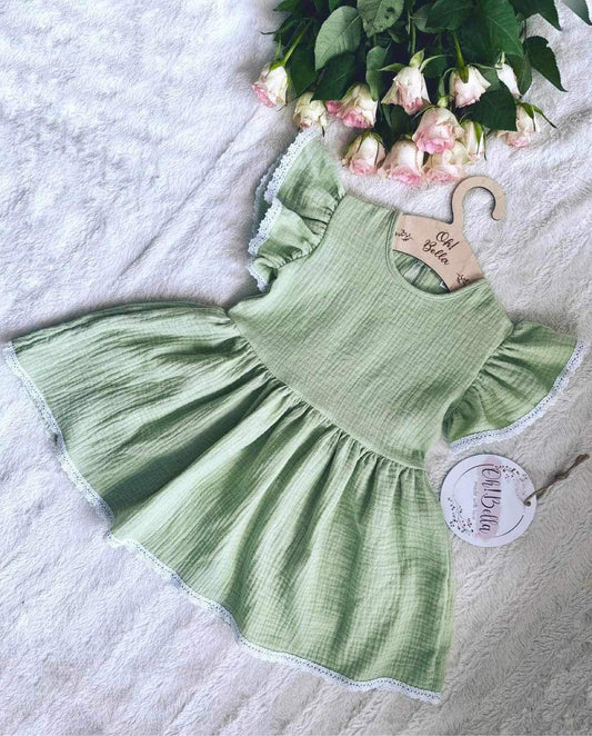 Meisjes Jurkje ‘Bella’ Mousseline Met Korte Mouwen Met Kant Lime-Groen