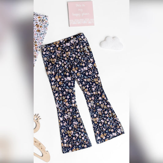 Meisjes Flair Broek ‘Fleur’ Met Wijd Uitlopende Pijpen Donker-Blauw Met Bloemenmotief