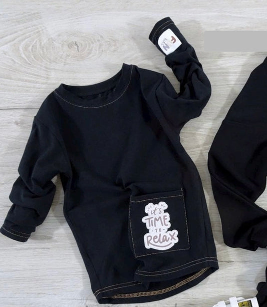Meisjes Longsleeve 'It’s Time To Relax' Met Opgenaaide Zak Zwart