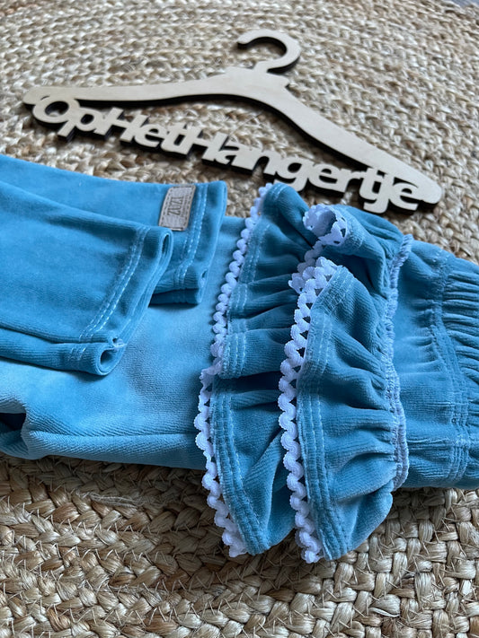 Meisjes Legging ‘Rosalie’ Velours Met Ruches Met Kant Hemels-Blauw