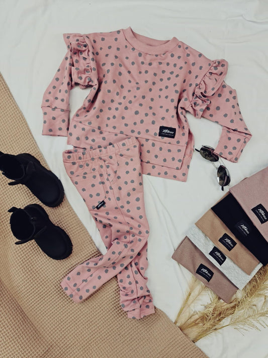 Meisjes Setje 'Stips' Sweatshirt met Ruches en Legging Roze Zilvergrijze Stippen