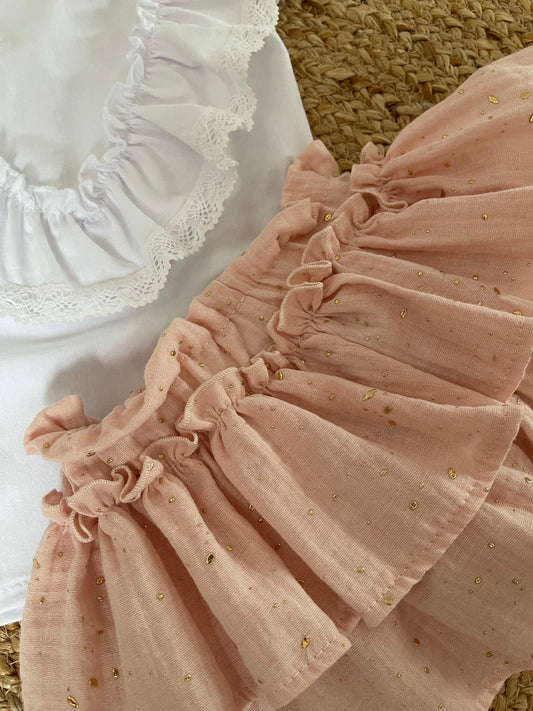 Setje T-shirt met ruche Wit met Mousseline Rokje met ruches en Goudklompjes Roze