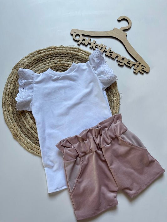 Setje T-shirt met borduursel Wit met Ribstof Short Oud Roze
