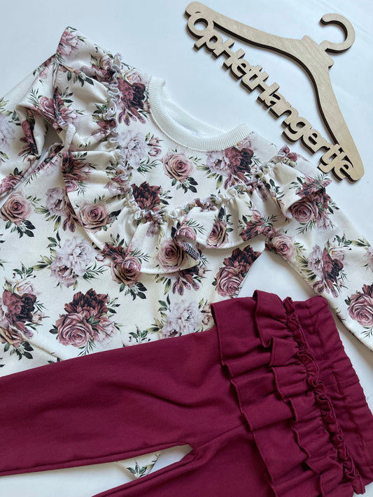 Setje Sweatshirt met Ruches Bloemenmotief met Legging met Ruches Bordeaux