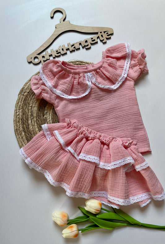 Setje Mousseline T-Shirt met Ruches Roze met Mousseline Bloomer Rokje met Ruches Roze met Haarspeld