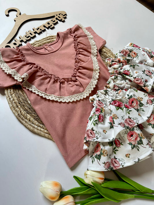 Setje T-Shirt met Ruche Oud Roze met Rokje met Ruches Bloemenmotief Ecru
